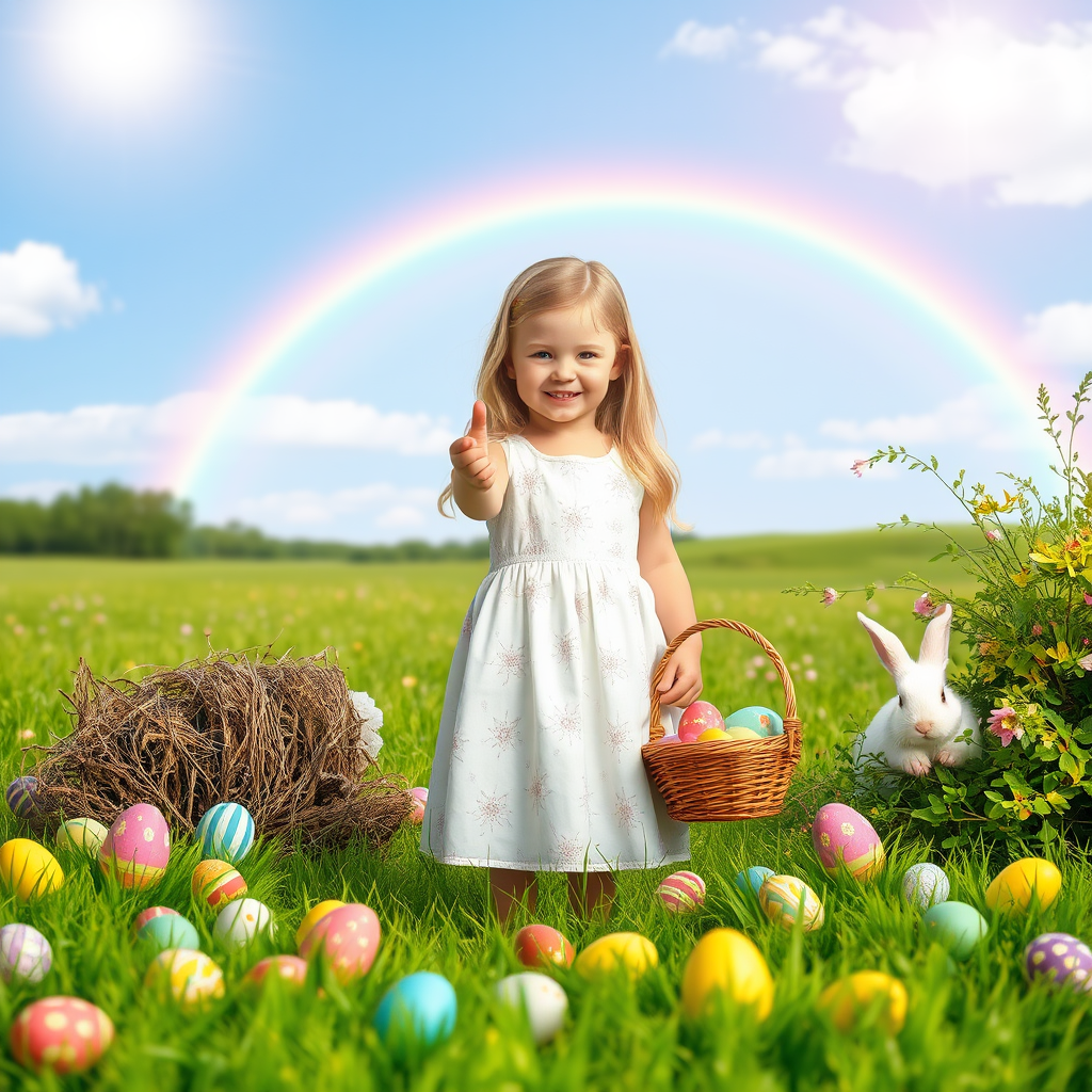 A young girl with golden hair stands in a lush meadow, surrounded by an array of colorful Easter eggs of different shapes and patterns. The sun beams brightly from above, lending a warm and inviting glow to the scene. She is dressed in a white frock adorned with a soft floral pattern and holds a wicker basket overflowing with vibrant eggs. Nearby, a fluffy white bunny peeks from behind a bush, its nose twitching playfully. In the sky, a splendid rainbow arches across the horizon, enhancing the magical atmosphere of the moment.