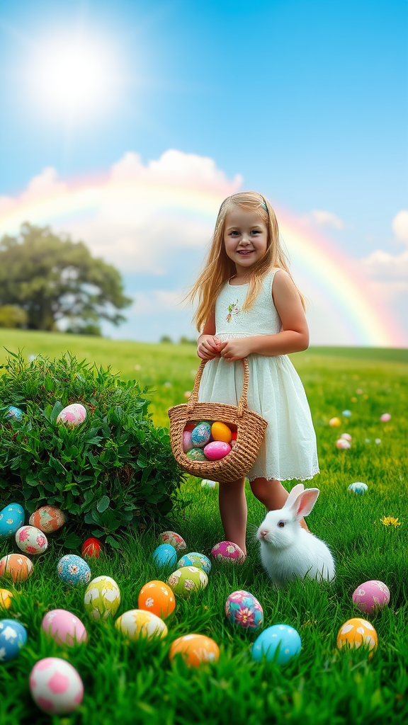 A young girl with golden hair stands joyfully in a lush meadow, surrounded by an array of colorful Easter eggs scattered about, each with unique patterns. The sun beams warmly from above, casting a gentle glow over the vibrant scene. She wears a white dress adorned with a subtle floral design and carries a woven basket overflowing with an assortment of bright eggs. Nearby, a fluffy white bunny peeks playfully from behind a bush, its curious eyes wide open. A magnificent rainbow arcs across the distant sky, adding a magical touch to the enchanting atmosphere.