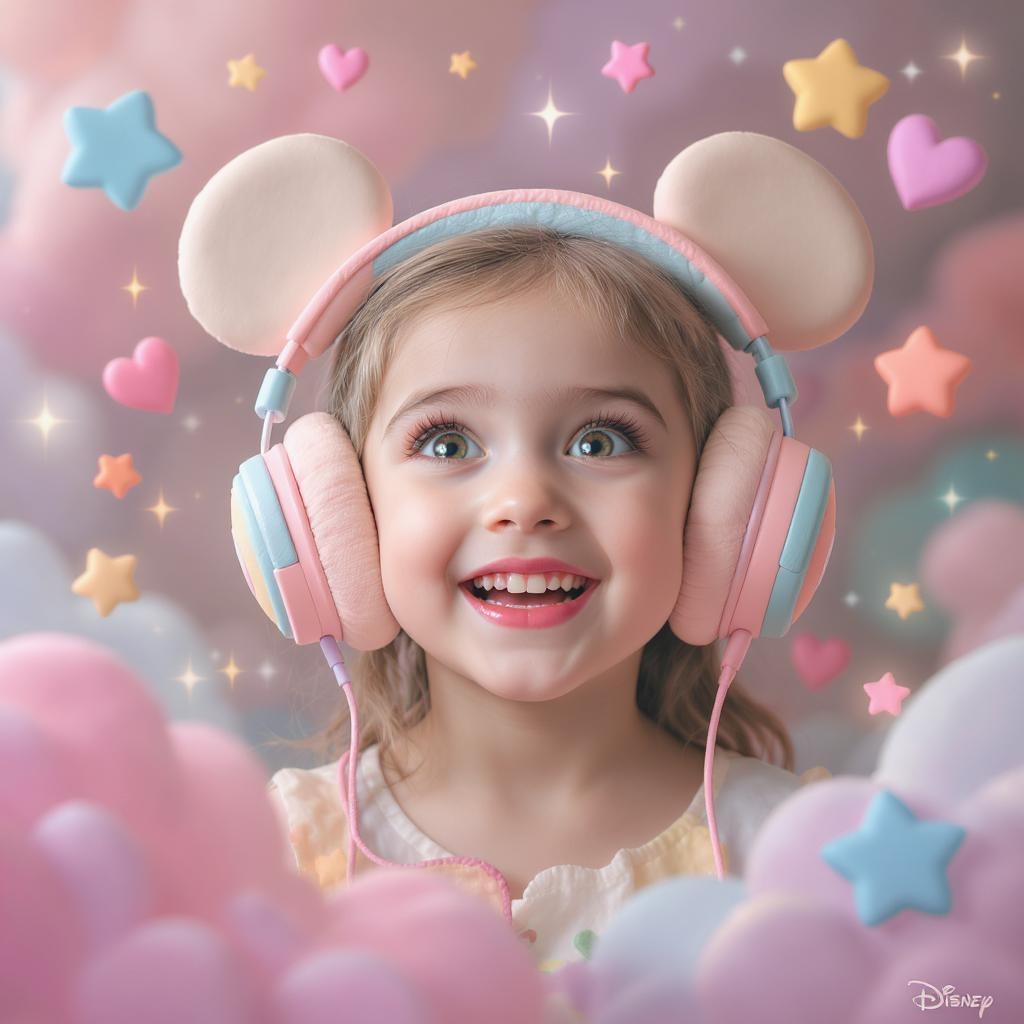 A young girl with large headphones, designed in a whimsical Disney-inspired style, with a charming clay-like texture, surrounded by a dreamlike, colorful background, bringing an aura of wonder and joy. Her expression is one of delight and curiosity, with vibrant eyes and a playful smile, capturing the essence of youthful imagination.