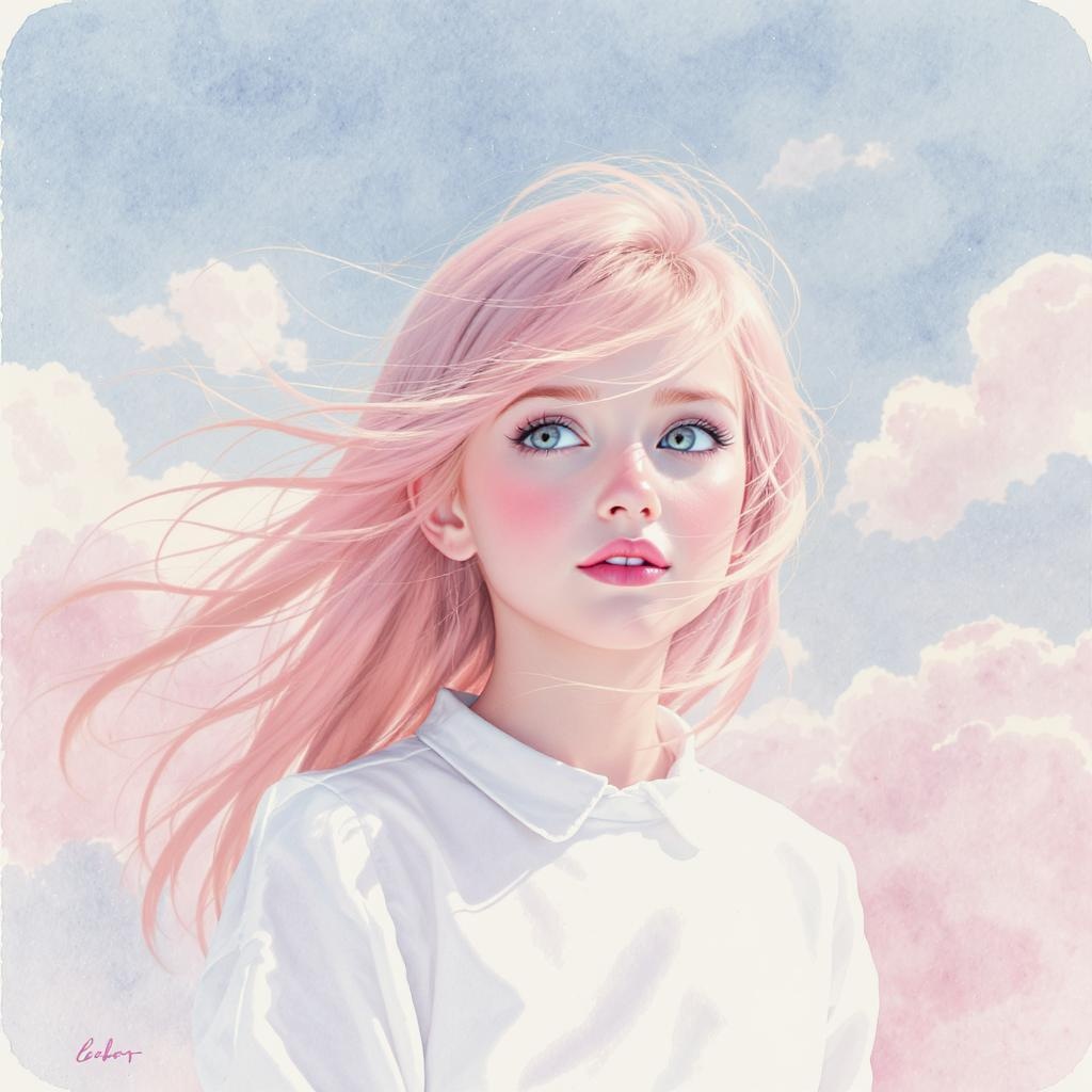 A young girl with pastel pink hair wearing a crisp white blouse, her eyes sparkling with curiosity. She stands against a backdrop of soft watercolor skies, the hues gently complementing her vibrant hair, as a gentle breeze playfully tugs at loose strands.