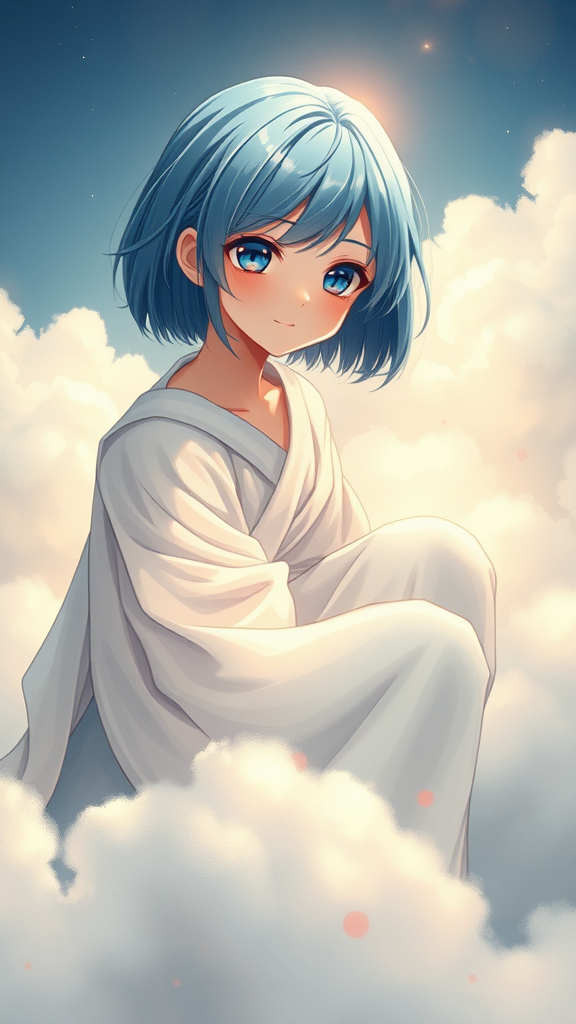 A young girl with short azure hair and striking sapphire eyes sits gracefully atop a fluffy cloud, her expression serene and contemplative. The anime-style illustration exudes a sense of ethereal beauty, with intricate detailing that highlights the delicate folds of her flowing, celestial robe. Soft, glowing light surrounds her, casting an otherworldly radiance that contrasts sharply with the subtle, darker hues interwoven into the cloud. Specks of crimson are interspersed across the scene, adding an unexpected layer of intensity and complexity. The art piece, inspired by the styles of Artgerm, Greg Rutkowski, and Alphonse Mucha, showcases elegant curves and flowing lines, rendered with digital precision. The smooth textures and sharp focus create a hyper-realistic effect, capturing the viewer's attention with its blend of grace and understated drama.