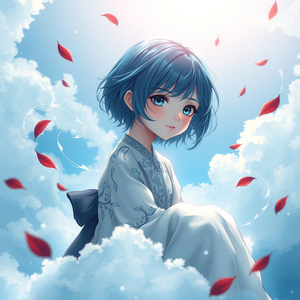 A young girl with short azure hair and striking sapphire eyes sits gracefully on a cloud beneath a luminescent sky, depicted in an anime style with hyper-detail. Her expression is serene yet haunting, her presence ethereal as wisps of cloud wind around her like tendrils. The light effect casts a gentle glow over her, illuminating the intricate and elegant patterns of her attire, which hint at a mysterious past. The scene is a delicate blend of artistry and emotion, with delicate blood-red petals floating in the air, adding a beautiful yet poignant contrast to the overall serenity. Crafted with digital precision, the illustration carries the smooth and sharp focus characteristic of Artgerm, Greg Rutkowski, and Alphonse Mucha, creating a captivating vision of grace and intrigue.
