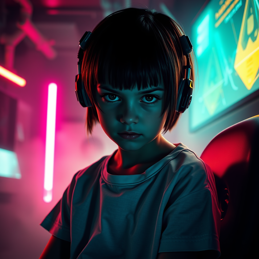 A young girl with short hair and an intense gaze, wearing a hospital gown, sits in a dimly lit room with flickering neon lights casting vibrant shadows; she has sensors attached to her head, surrounded by an aura of synth wave vibes. The cinematic atmosphere is heightened by a futuristic setting with glowing screens and ethereal mist, evoking a sense of mystery and otherworldly power. The scene is portrayed in a realistic style with a strong emphasis on dramatic lighting and a neon-hued color palette.