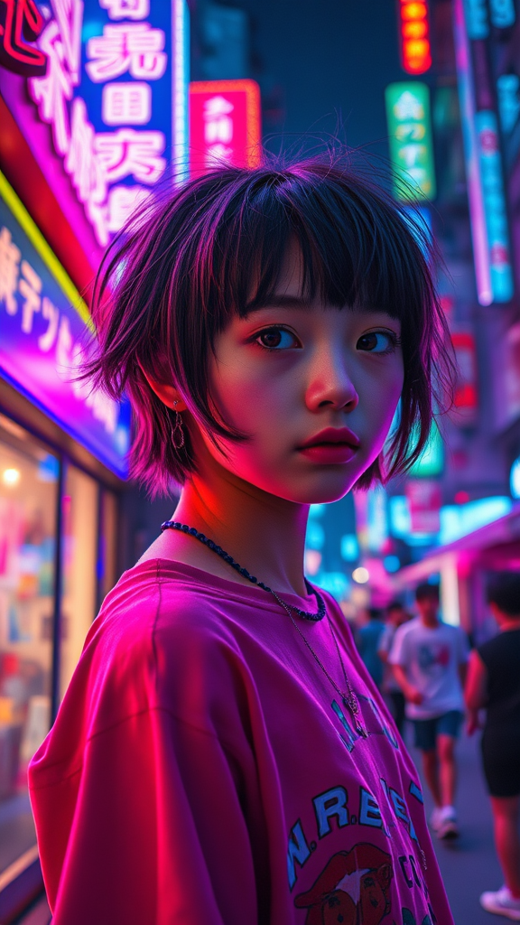A young girl with short, tousled hair stands in a bustling cityscape, her figure bathed in the vibrant glow of neon lights from a nearby store. The scene is rendered with hyper-realistic detail, capturing the essence of cult party kei fashion with its eclectic and whimsical style. The atmosphere pulsates with the otherworldly allure of alienpunk, offering a symphony of colors and light that dance across her features. This richly detailed image mirrors the depth and texture of an Ivan Marchuk painting, with the precision and clarity reminiscent of a photograph taken with a Fujifilm X-T4 and a Sony FE 85mm f/1.4 GM lens. The portrait, framed in a 3:4 aspect ratio, immerses the viewer in a raw, unfiltered world with a touch of fantasy and an exploration of the interplay between urban life and vibrant imagination.
