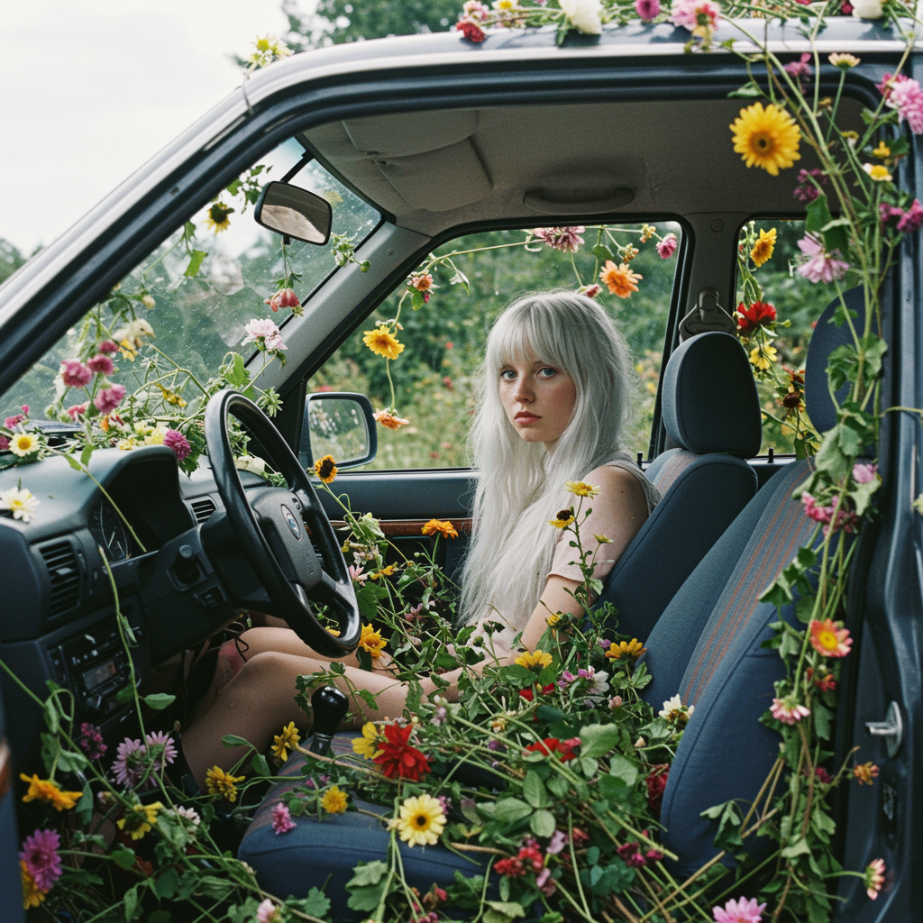 A young girl with striking white hair sits calmly in the driver's seat of a car, surrounded by a lush explosion of vivid flowers pouring over the dashboard and seats. The scene, inspired by Rinko Kawauchi, holds a naturalistic grace, embodying the effortless charm of vacation dadcore and youthful energy. Her expression is cool and serene, while her body seems to blend into the tapestry of blossoms and vines that envelop her. Outside, the sky is a mosaic of flowers as if nature itself is celebrating. The image is captured with dreamy lofi photography, rich in super detail, and reminiscent of analog film, providing a colorful and whimsical inside view. Shot on Fujifilm XT4, every hue is vibrant and alive, making the car a makeshift garden oasis.