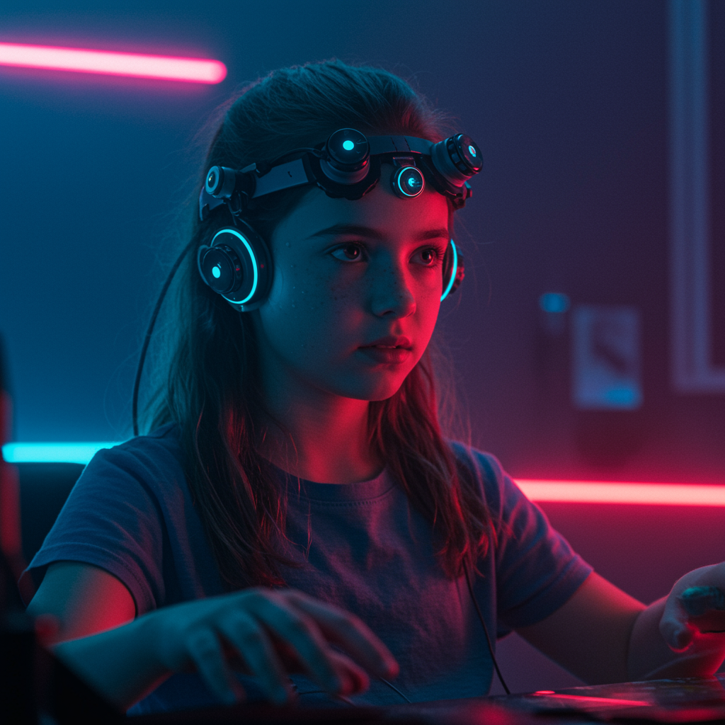 A young girl with telekinetic powers sits in a dimly lit laboratory, sensors attached to her head, her eyes full of determination as she taps into her extraordinary abilities. The room is bathed in the glow of synth wave aesthetics, with neon lights casting vibrant hues across her face. The scene captures a sense of tension and mystery, reminiscent of 80s sci-fi, as cinematic lights highlight the intricate details of the futuristic environment.