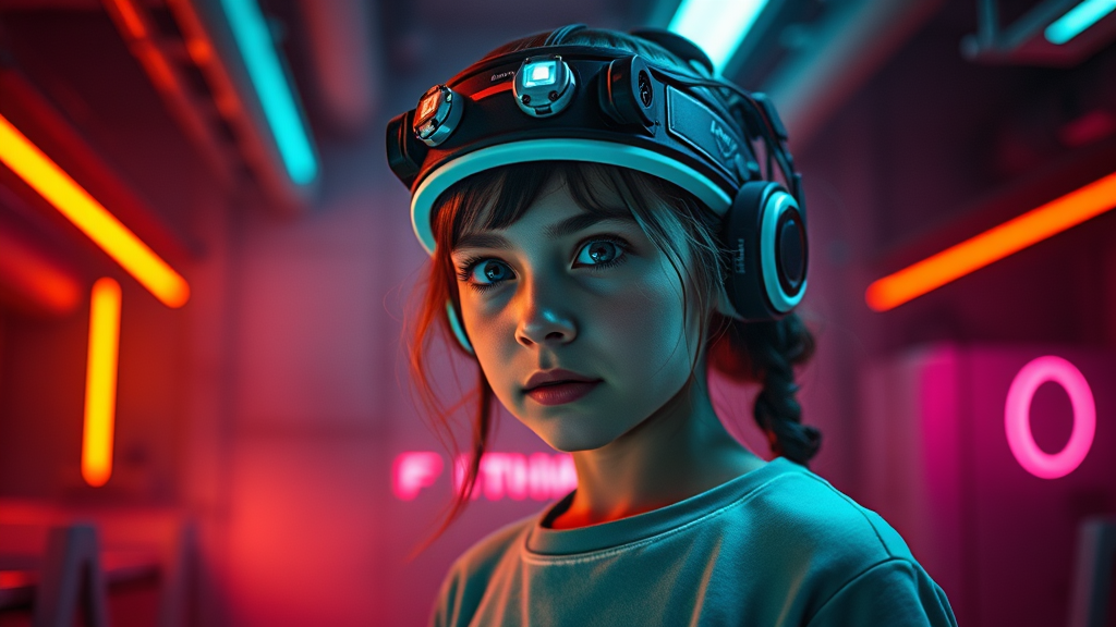 A young girl with telekinetic powers, wearing a headband adorned with sensors, stands in an enigmatic lab. Neon lights cast a glowing, vibrant aura around her, highlighting her intense focus. The atmosphere is rich with synth wave elements, creating a cinematic landscape that blends realism with a futuristic, retro style. Her gaze pierces through the ambient haze, as if she's aware of an unseen dimension.