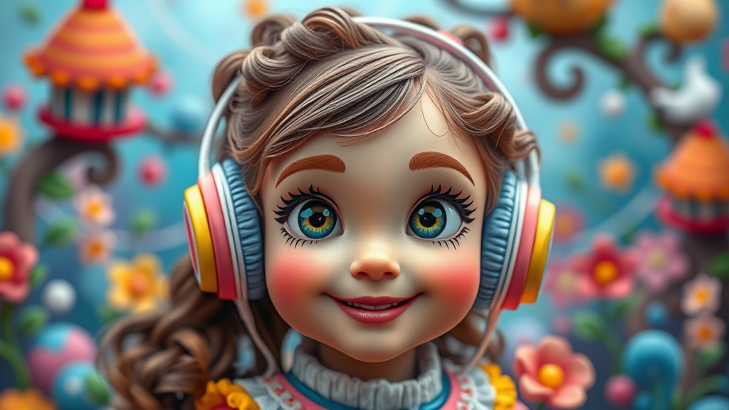 A young girl with vibrant headphones, styled in enchanting Disney fashion, her features crafted with a charming clay-like texture, surrounded by a whimsical, colorful world, eyes wide with wonder and imagination, soft curls framing her joyful face as she explores a magical realm filled with dreams and melodies.