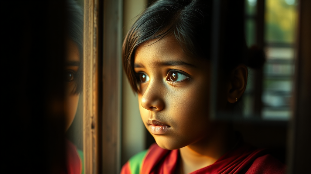 A young Indian girl gazes intently out of a window, her distinctive nose catching the soft play of light and shadow. The scene captures the essence of manipulated photography, with the world outside mirrored in the glass, her reflection creating a dreamlike symmetry. Taken with a vintage Hasselblad 1600F, the image vibrates with emerald and amber hues, imbuing the moment with a timeless, romantic emotion that flickers like an old photograph discovered anew.