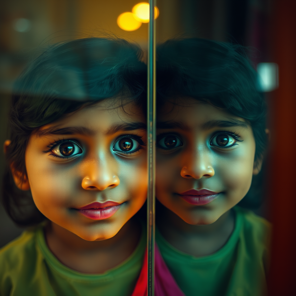 A young Indian girl gazes out the window, her distinctive nose creating a unique focal point in this manipulated photograph. The flickr-inspired image, captured with a hasselblad 1600f, features a mirrored effect that doubles the child's curious expression. Hues of emerald and amber illuminate the scene, casting a dreamlike glow over her face. The photograph exudes a romantic emotion, capturing the wistful wonder of childhood as soft light dances across the glass, highlighting her inquisitive eyes and gentle smile.
