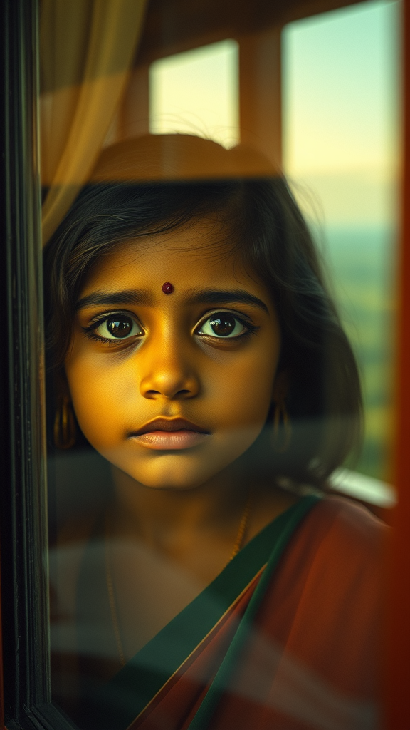 A young Indian girl gazes out the window, her distinctive nose and expressive eyes capturing a sense of wonder and contemplation, the scene reflected in mirrored glass. Manipulated photography reveals a dreamy landscape bathed in hues of emerald and amber, evoking romantic emotion. Shot with a vintage Hasselblad 1600F, the image carries a nostalgic essence, reminiscent of a cherished photograph found on an old Flickr stream.