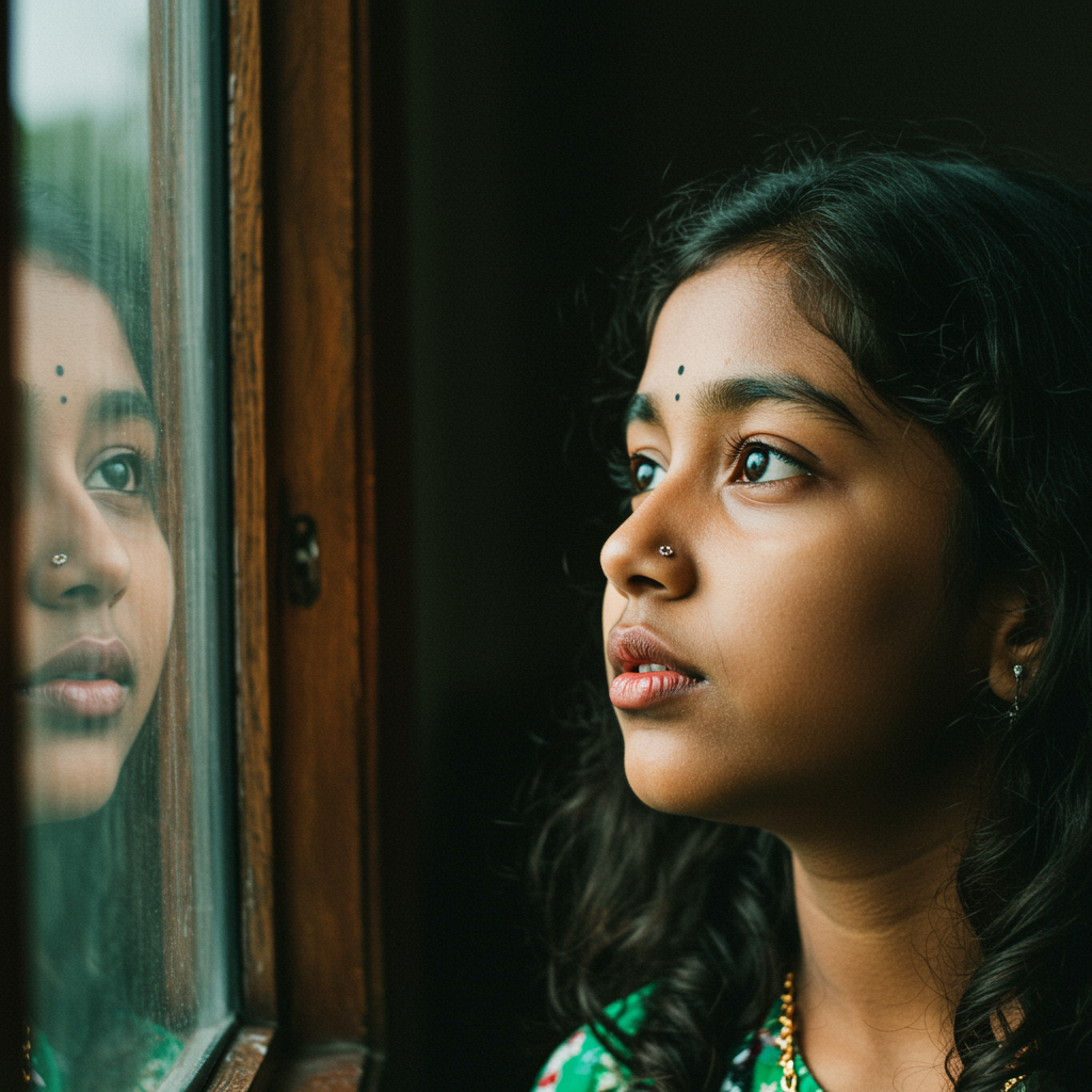 a young indian girl gazes out the window, her distinctive nose softly catching the light, the scene captured in manipulated photography reminiscent of flickr aesthetics, a mirrored reflection enhancing the symmetry, shot with a hasselblad 1600f, hints of emerald and amber infusing the image with romantic emotion, her expression a blend of curiosity and wonder