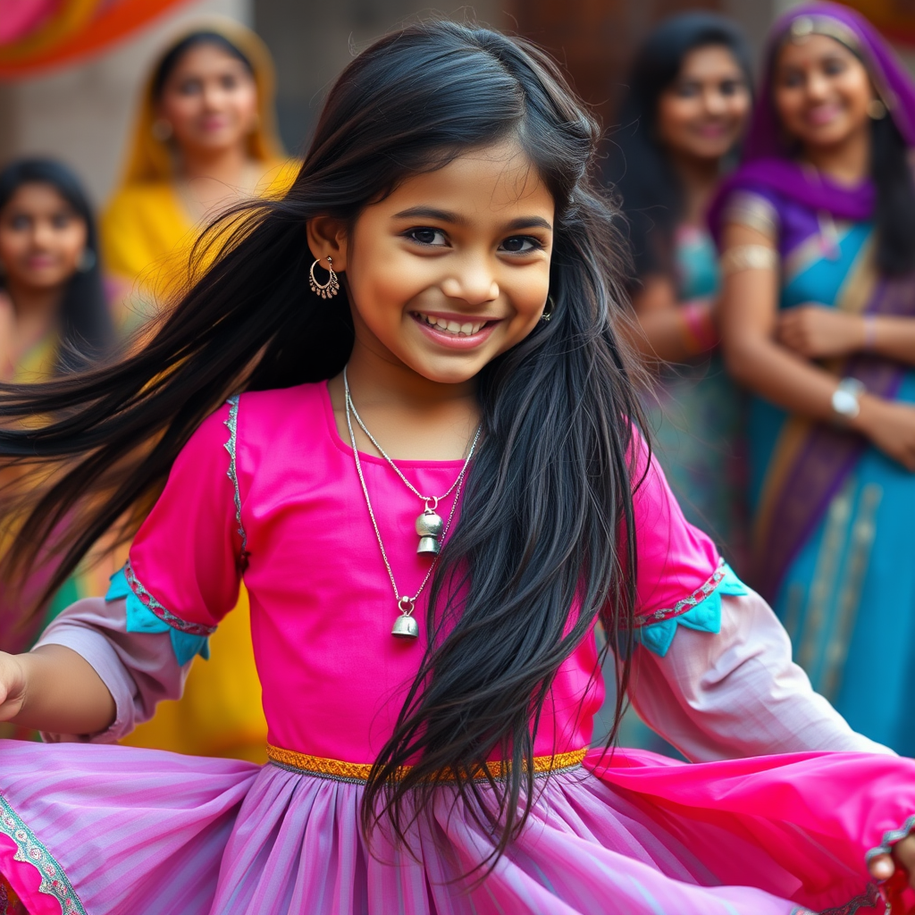 A young Indian girl twirls with abandon, her bright pink and turquoise dress shimmering as the fabric flows behind her. A delicate silver necklace with tiny bells and a tiny turquoise charm catches the light, adding a whimsical touch to her vibrant traditional attire. Her long, raven-black hair cascades down her back like a waterfall, its dark locks contrasting beautifully with the bright colors of her outfit. Her face is alight with an infectious grin, her eyes sparkling with delight as she loses herself in the music and rhythm of the celebration. The background is a soft blur of colorful fabrics and smiling faces, but the focus remains firmly on the girl's carefree joy and dance.