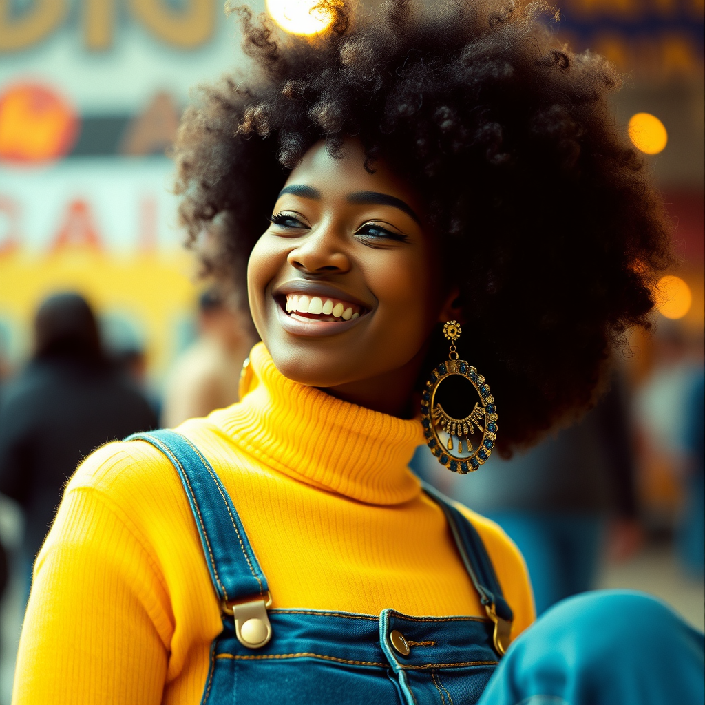 A young, joyful woman with a rich dark complexion and voluminous afro hairstyle, wearing an eye-catching yellow turtleneck sweater. She's adorned with large, statement earrings and stylish bell-bottom jeans. The color palette blends vibrant yellows and cyans, reflecting a 1970s hip-hop vibe. The scene is captured as a cinematic masterpiece with high frequency details, using a 35mm film aesthetic that adds a nostalgic film noise. Shot with Kodak ProImage 100, the image features a delicate depth of field and soft bokeh, creating a warm, authentic atmosphere.