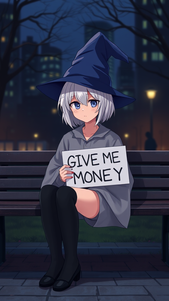 A young lady with short white hair sits alone wearing a wizard hat, her face partly shaded. She's dressed in an oversized shirt and black thigh-high socks, paired with shorts. Her expressionless face and empty eyes gaze into the night, as she relaxes on a park bench in a cityscape. Holding a sign that reads "GIVE ME MONEY," she appears amidst a detailed and high-quality 2D illustration. The scene has a nighttime depth of field, capturing the serene yet mysterious atmosphere of a quiet city park. The focus is sharp and clear, free of distortions and imperfections, creating a sense of calm and introspection.