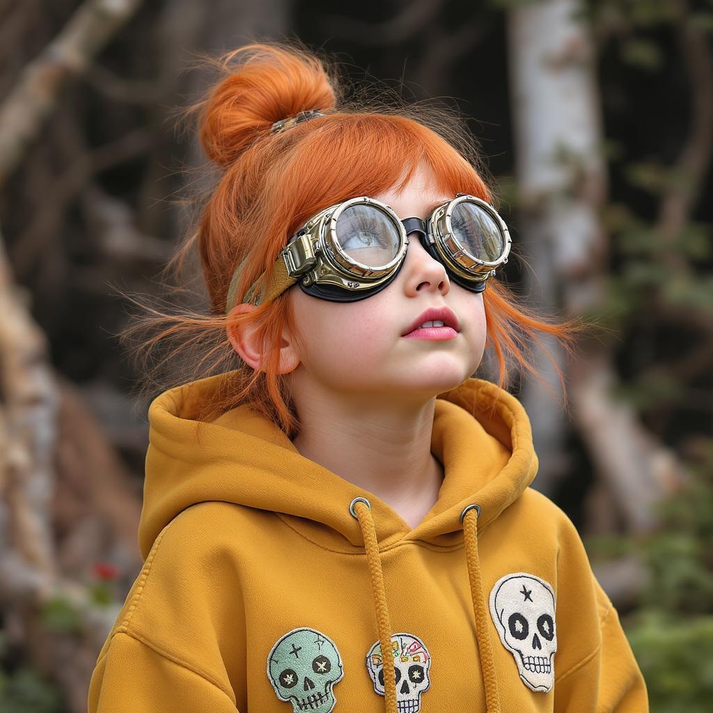 A young, light-skinned girl, around 14 years old, with bright, fiery orange hair styled in a loose, windswept bun, wears large, intricately-designed steampunk goggles with aged, metallic accents. Her expression is contemplative, eyes gazing upwards. She sports an oversized hoodie in a rich mustard yellow, with a slightly distressed finish, featuring hand-sewn patches depicting abstract, edgy designs, including stylized skulls, adding a unique, handcrafted charm.
