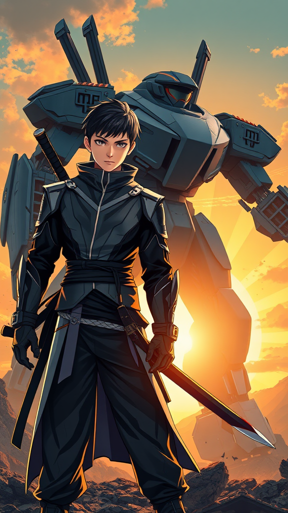 A young man clad in a sleek, futuristic samurai suit stands confidently, drawing inspiration from classic Soviet poster art with a dynamic display of a sword and shuriken set against him. The backdrop features a towering Ninja Mech, silhouetted against the emerging dawn, with beams of warm light piercing through. The style merges anime and manga graphics, utilizing dark, bold colors typical of offset printing for a high detail finish. The composition is vibrant and energetic, reflecting a sense of happiness and optimism. The cinematic lighting adds depth and contrast, capturing the essence of an 8K, HD, CMYK poster in a 9:16 aspect ratio.