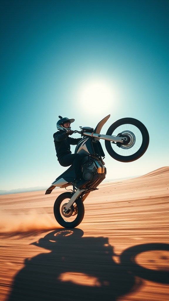 A young man dressed in sleek black attire rides a cutting-edge electric dirt bike across a sprawling desert landscape. His bike is a luxurious carbon-crafted, battery-powered machine, epitomizing futuristic design. Captured in a dramatic wide-angle shot, the scene showcases the rider performing a wheelie at high speed, accentuated by dynamic motion blur. Atmospheric lighting enhances the scene, while professional color grading brings out a moody atmosphere under a deep blue sky, utilizing a polarizing filter. The composition exudes a contemporary modernist photography style, with an 8k uhd quality image, ensuring a vivid and engaging visual experience, free of vignettes or uninteresting elements.