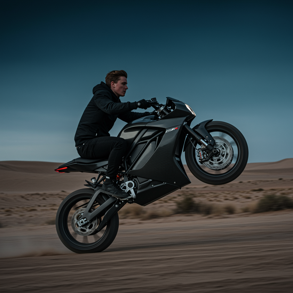 A young man dressed in sleek black attire rides an advanced, high-end carbon electric motorbike across a sprawling desert landscape. The battery-powered bike exudes a sense of futuristic design as the scene captures a wide shot in landscape orientation. The composition is dynamic, showcasing a powerful wheelie at high speed, with elements of motion blur adding to the sense of exhilaration. The photograph is rendered in 8k UHD, with atmospheric lighting and a moody ambiance enhanced by a polarizing filter under a rich, dark blue sky. The image avoids any vignette or monotonous elements, emphasizing the cutting-edge electric innovation over traditional combustion engines.