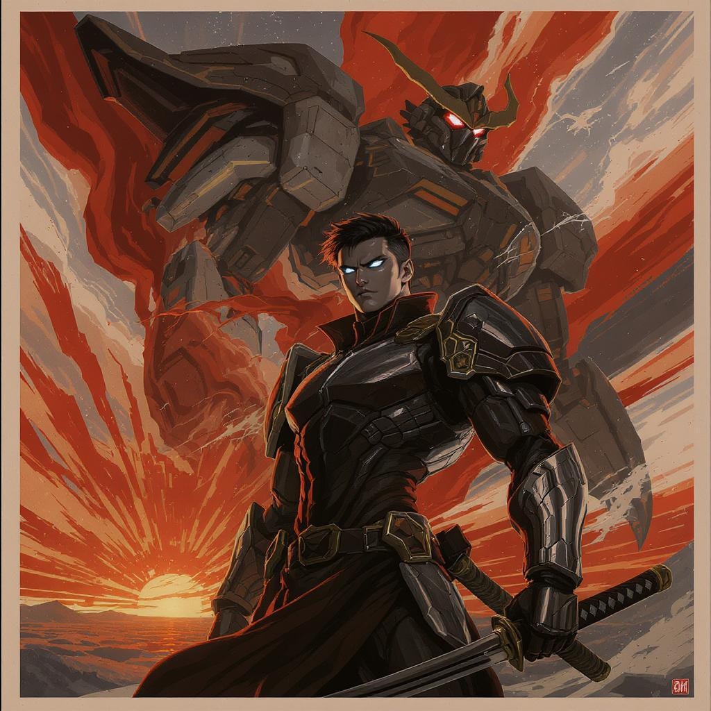 A young man in a futuristic samurai suit stands confidently, embodying the essence of a classic Soviet poster style. His determined expression is highlighted by the dynamic lighting of dawn breaking on the horizon. In the backdrop, a formidable Ninja Mech looms, exuding both power and mystery. Dark, rich colors lend depth to this epic scene, reminiscent of anime and manga graphics, rendered with the precision of offset printing. High-detail CMYK elements capture the intricate design of a sword and shuriken, echoing traditional warrior symbols. The composition promises a cinematic experience, exuding an energy that is both happy and revolutionary. The poster's 8K HD quality brings every detail to life, making it an unforgettable visual narrative.