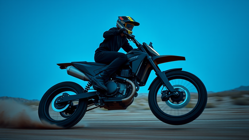 A young man in sleek black attire races through the desert on a cutting-edge carbon fiber electric dirt bike, its battery-powered engine propelling him forward. The scene captures a wide, scenic view where modernist-inspired photography influences the composition. From a low angle, the bike's dynamic motion is emphasized as it performs an effortless wheelie, while motion blur enhances the sensation of high speed. The 8K UHD image showcases moody, atmospheric lighting, professionally color graded to highlight the contrast between the dark blue sky and the vibrant desert landscape. A polarizing filter enhances the scene's dramatic effect, eschewing any vignette, and ensuring a polished, futuristic aesthetic.