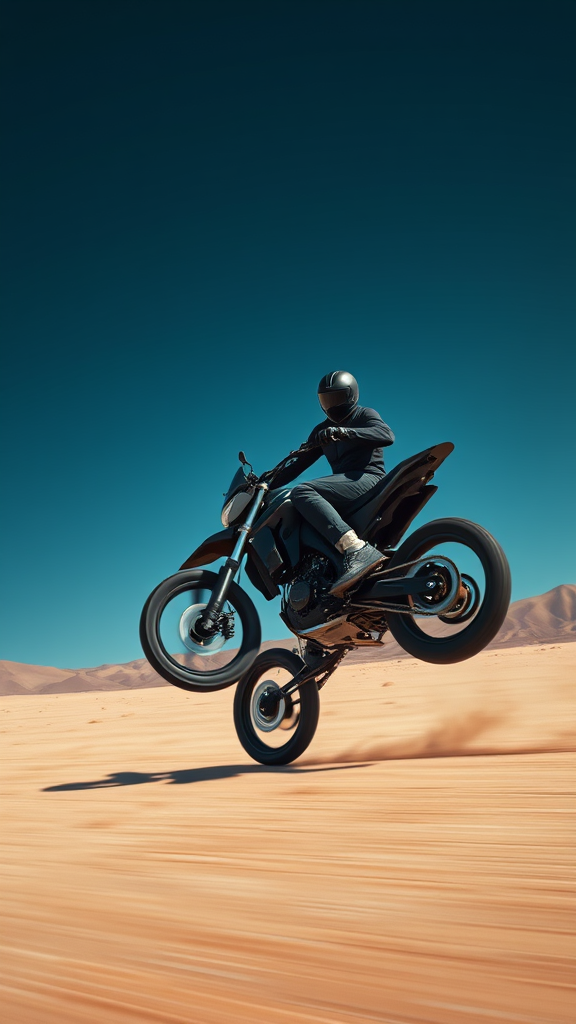 A young man in sleek black attire rides an advanced carbon electric dirt bike across a vast desert landscape. The bike, battery-powered and cutting-edge, glides at high speed, emphasizing a dynamic composition as it performs an impressive wheelie. Captured in contemporary modernist-style photography from a low angle, the scene is presented in 8k UHD with motion blur accentuating the sense of speed. The atmospheric lighting casts a moody ambiance under a dark blue sky, enhanced by a polarizing filter. Professionally color graded, the image offers a rich, cinematic feel with no vignette, focusing purely on the futuristic energy of the moment.