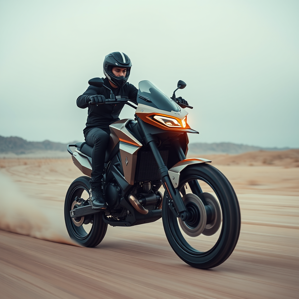 A young man racing through the barren desert on an electric dirt bike, dressed in sleek black attire, astride a luxurious silver-gold futuristic machine. The low-angle, sweeping wide shot captures the sense of speed, with the bike executing a dramatic wheelie in a composition that conveys dynamic motion. The image is rendered in high-definition 8k, with atmospheric lighting that enhances the moody, contemporary modernist aesthetic. Professional color grading highlights contrasts and textures, while motion blur underscores the high-speed thrill of the scene. The emphasis is on cinematic quality and artistry, avoiding any sense of the mundane or overused.