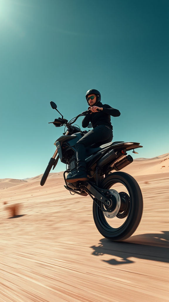 A young man rides a sleek electric dirt bike across the desert, dressed in stylish black attire. The scene features a cutting-edge carbon fiber electric motorbike, powered by an advanced battery. The shot captures a stunning wide-angle landscape from a low perspective, emphasizing a high-speed, dynamic composition with the rider performing a wheelie. Motion blur conveys speed and adrenaline, captured in breathtaking 8k UHD quality. The lighting is atmospheric, professionally color graded to enhance a moody effect, with a polarizing filter intensifying the dark blue sky. The composition is vivid and clear, devoid of vignettes or mundane elements. The modernist photography style ensures a refined and engaging visual.