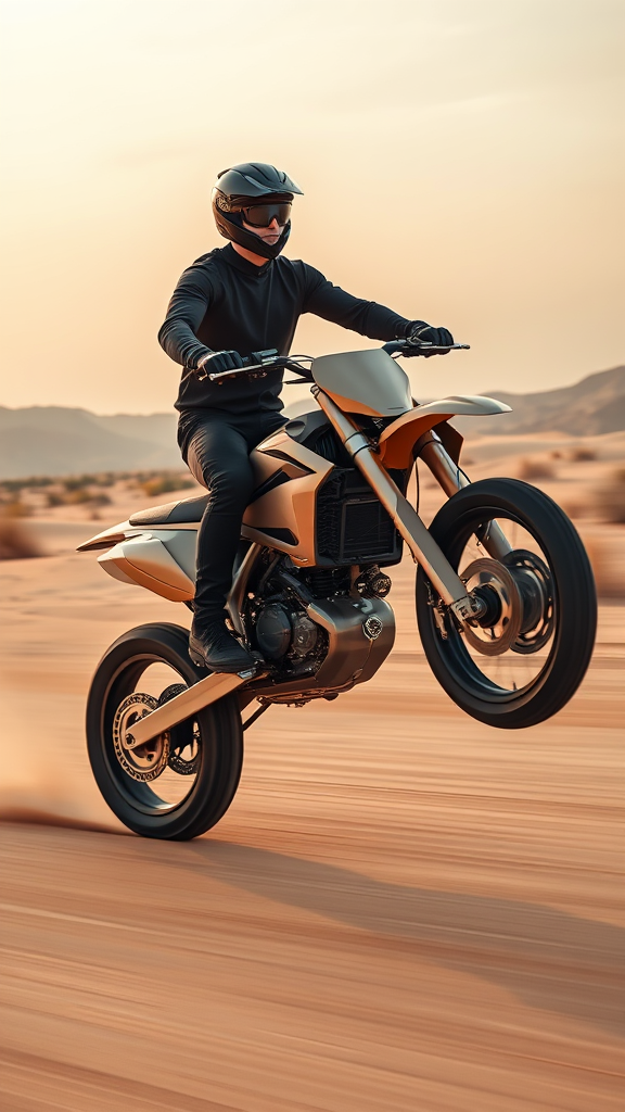 A young man rides an electric dirt bike across a desert landscape, dressed in sleek black attire. The bike is an exquisite silver-gold futuristic model, captured from a low angle to emphasize its design and elegance. The scene is a scenic wide shot in the style of contemporary modernist photography, capturing the high speed and dynamic motion as the rider performs a wheelie. The image features a touch of motion blur to convey speed, rendered in 8k UHD with atmospheric lighting and professional color grading to create a moody ambiance. The composition is free from vignettes or cropping, avoiding any sense of being mundane or cheap.