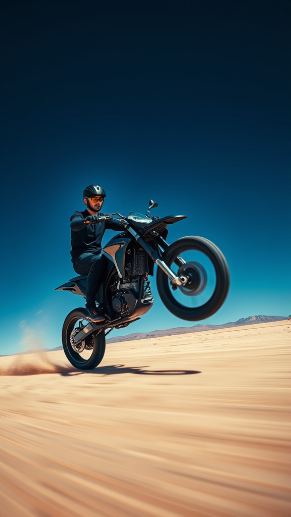 A young man rides an electric dirt bike across the desert landscape, dressed in sleek black attire. The bike is a high-end, carbon-fiber model with a futuristic design, powered entirely by battery. Captured in a sweeping, low-angle shot typical of contemporary modernist photography, the scene emphasizes high speed and dynamic movement, featuring a daring wheelie and subtle motion blur. The image is rendered in stunning 8k UHD resolution with atmospheric lighting and expert color grading, creating a moody yet vibrant visual. The composition includes the deep contrast of a dark blue sky enhanced by a polarizing filter. The setting is expansive and dramatic, free from vignettes and any hint of traditional combustion engines.