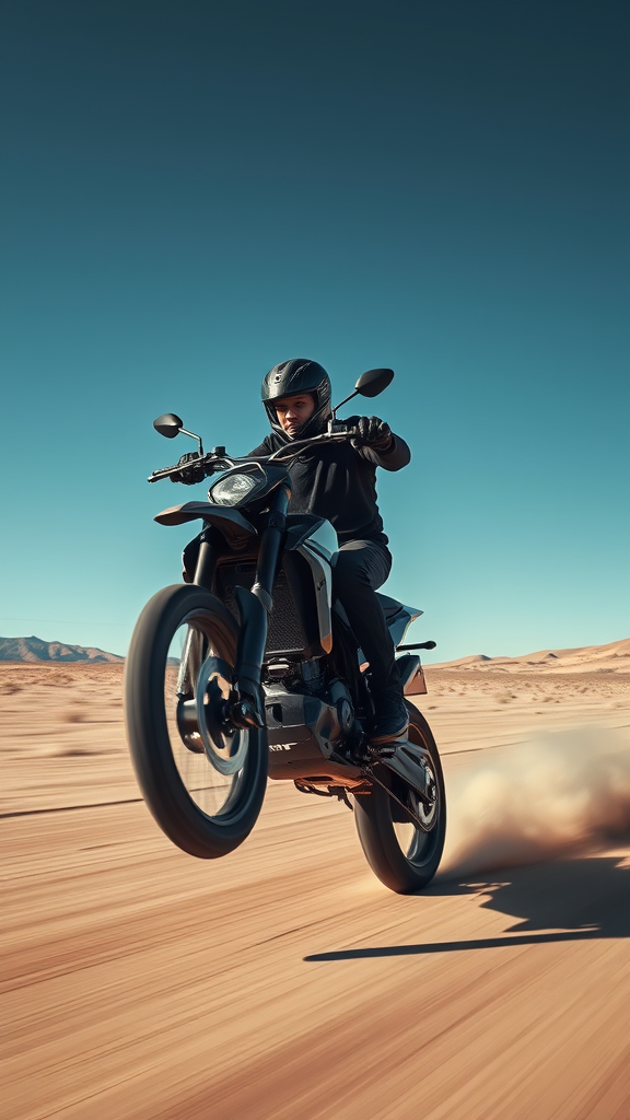 A young man riding a sleek electric dirt bike through a vast desert landscape, clad in stylish black attire. The futuristic carbon design of the battery-powered motorbike shines under the atmospheric light, captured in a dynamic composition showcasing high-speed motion with a focus on a dramatic wheelie. The scene, in the style of contemporary modernist photography, features motion blur and an expansive view captured in 8K UHD. The deep blue sky overhead contrasts with the moody, professionally color-graded tones, emphasized by a polarizing filter bringing out vivid details without vignette. The shot avoids any hint of being cropped, mundane, or associated with traditional combustion engines.