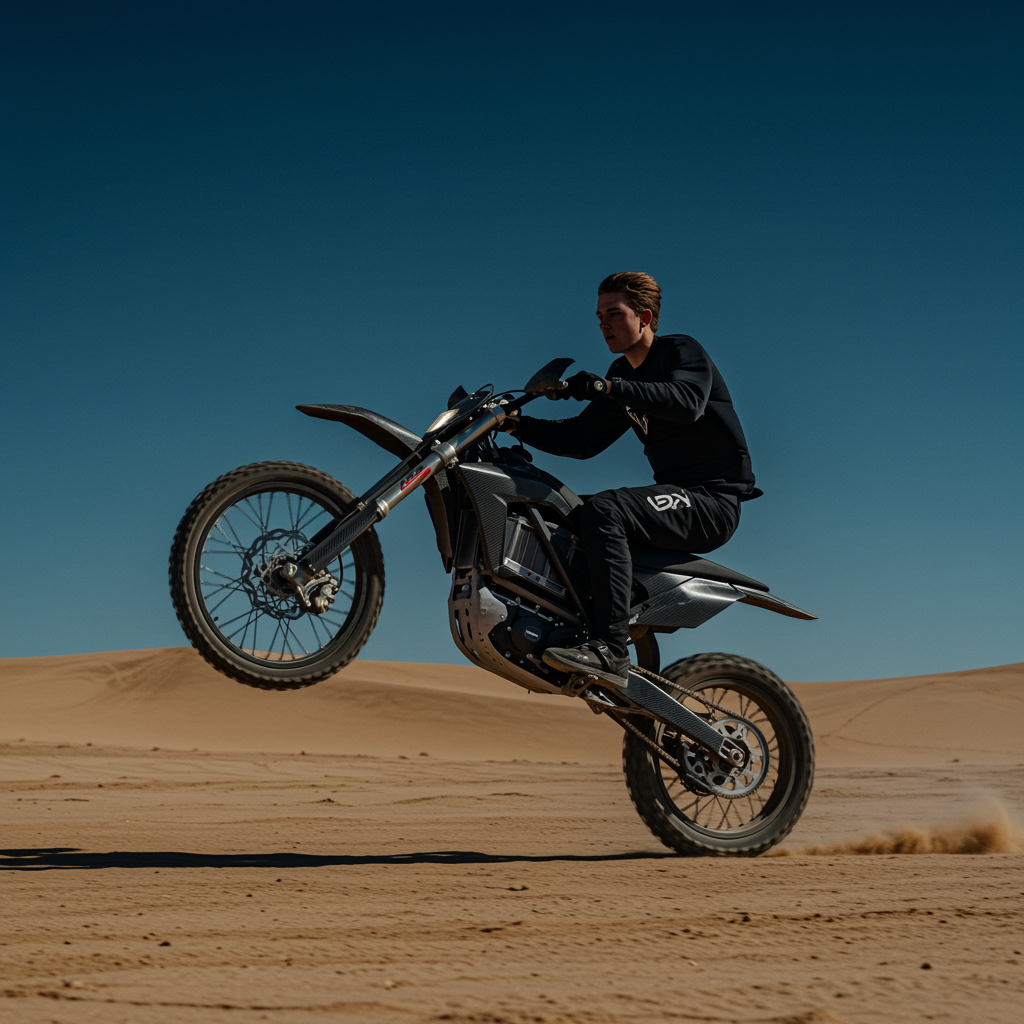 A young man riding an advanced electric dirt bike in the vast desert, dressed in sleek black gear, atop a high-end carbon futuristic motorcycle, powered by cutting-edge battery technology. Captured in a scenic wide shot with a low angle perspective, the image exudes the essence of contemporary modernist photography. The composition is dynamic and full of energy, featuring a high-speed wheelie with subtle motion blur. Rendered in stunning 8k UHD, the atmospheric lighting enhances the scene with a moody and dramatic effect. A polarizing filter intensifies the deep blue sky, creating a striking contrast. Expertly color graded to emphasize the electrifying experience, while maintaining a clean and uncluttered frame, set against the expansive and open desert backdrop without unnecessary embellishments.