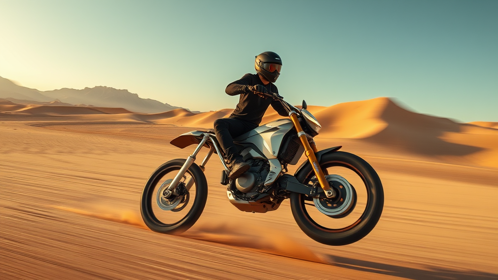 A young man speeding across the desert on a sleek electric dirt bike, dressed in stylish black apparel, atop an exquisitely crafted silver-gold futuristic bike. Captured from a dynamic low angle, the wide scenic landscape shot conveys high-speed motion with a dramatic wheelie, enhanced by motion blur. The image boasts 8k ultra-high-definition quality with atmospheric lighting, professionally color graded to evoke a moody yet vibrant tone, ensuring it remains engaging without vignetting or any hints of cropping or cheapness.