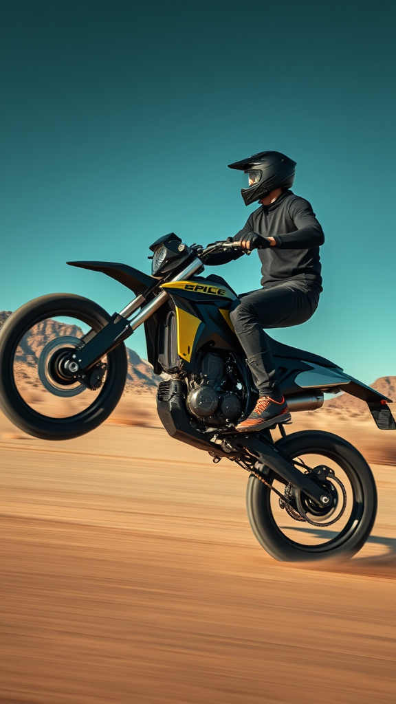 A young man speeding across the desert on a sleek and costly carbon-fiber electric dirt bike, dressed in stylish black attire, against a backdrop of dramatic landscapes. Captured in a scenic wide-angle frame with a low perspective, the shot embodies the essence of contemporary modernist photography. The bike rears into a wheelie, with motion blur enhancing the sense of high velocity. The photograph is in 8k ultra-high-definition, with atmospheric lighting that casts a moody and polished aura. The expertly color-graded image features a dark blue sky, enhanced by a polarizing filter, avoiding vignettes or anything dull. Electric power pulses through the futuristic machine, setting it apart in this dynamic composition.