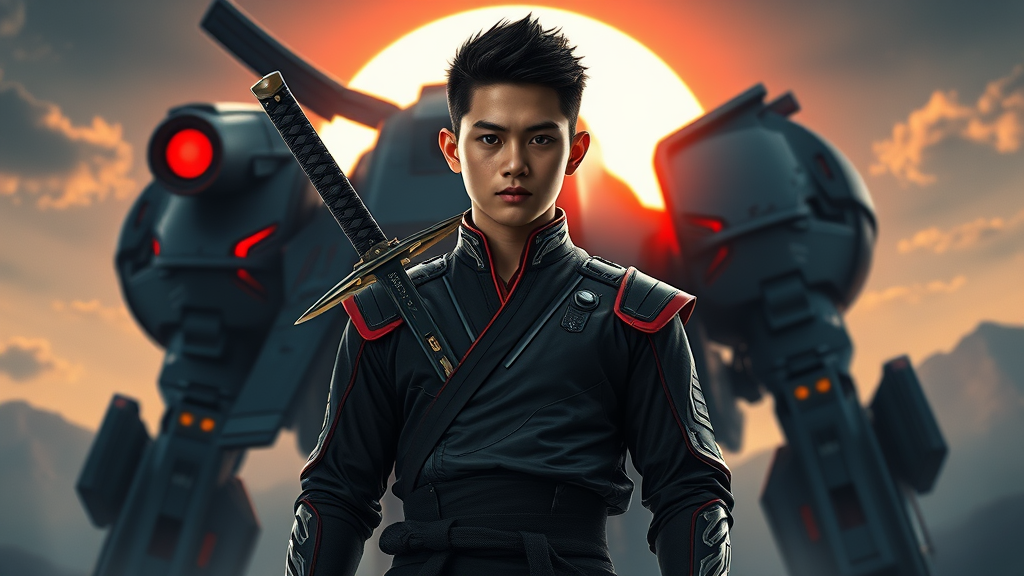A young man stands boldly in a sleek, futuristic samurai suit with intricate details reminiscent of Soviet poster art. His eyes are determined, and his stance exudes confidence. Behind him, a gleaming sword and shuriken are sharply poised against the backdrop of an imposing Ninja Mech rising with the dawn's early light. The scene is painted in a palette of dark, vivid colors, infused with the dramatic flair of anime and manga graphics. The composition reflects the meticulous craftsmanship of offset printing, capturing every high-detail nuance in an 8K, HD, CMYK poster format. The atmosphere is one of joy and hope, enhanced by cinematic lighting that highlights the young warrior's optimistic spirit within this blend of past and future visions.