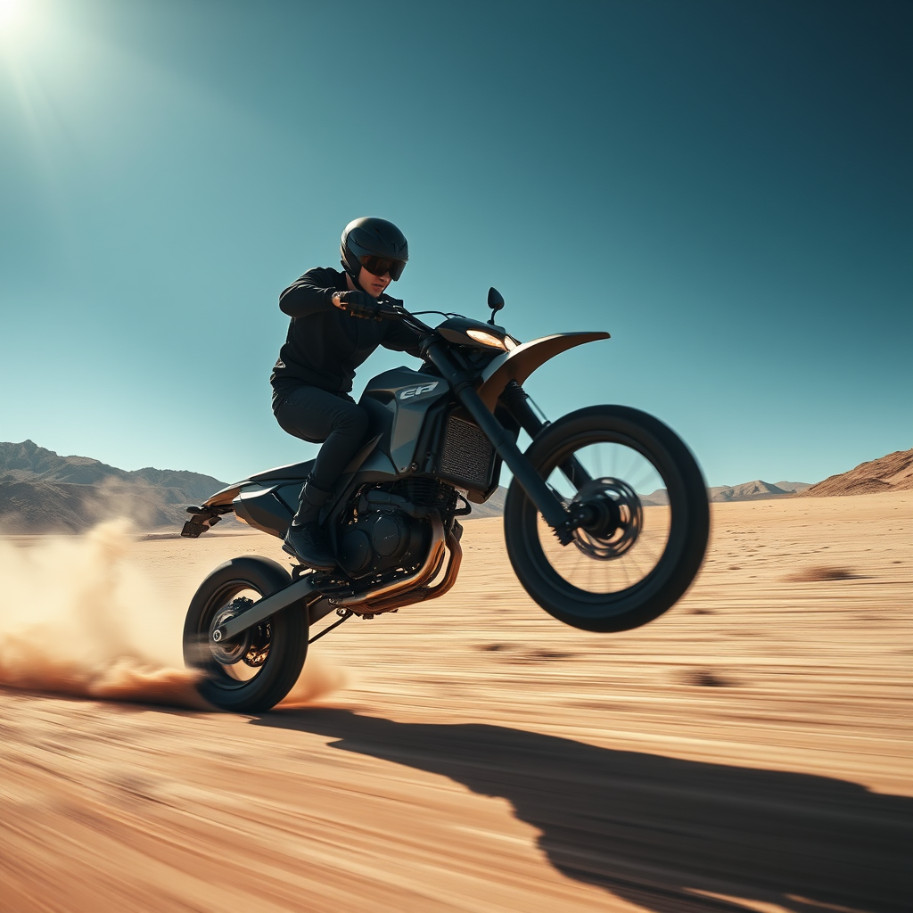 A young man wearing sleek black attire is skillfully riding an advanced electric dirt bike through the vast, rugged desert. The bike, a state-of-the-art carbon design, gleams under the high-speed dynamic composition of modernist photography. Captured in a cinematic wide shot with a low angle, the bike pops a wheelie, adding thrill to the scene. The motion blur enhances the sense of speed as it zips by in 8k ultra-high-definition clarity. The atmospheric lighting casts an evocative, moody tone over the landscape, with a polarizing filter intensifying the deep, dark blue of the expansive sky. The setting is devoid of any petrol or combustion engines, focusing solely on the innovative, battery-powered technology at play.