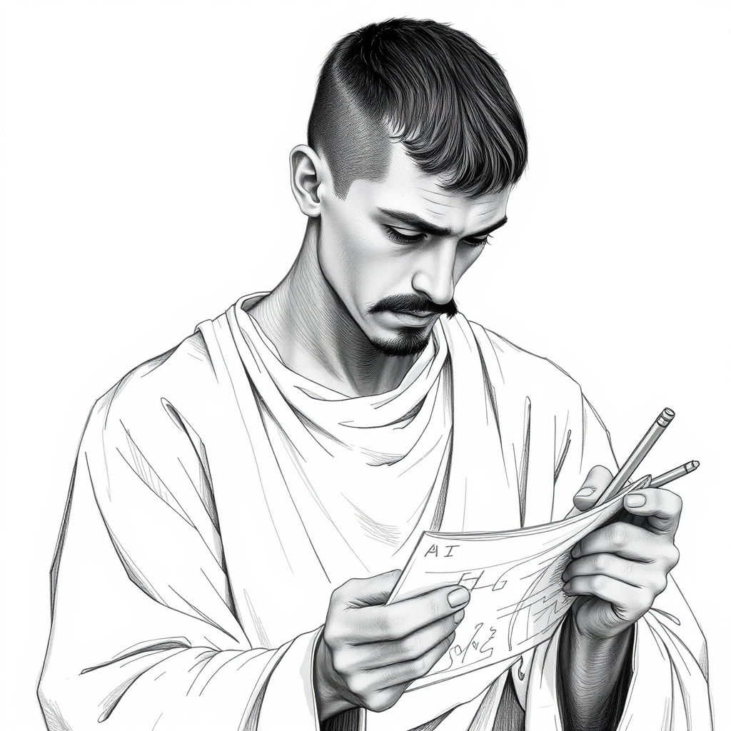 A young man with a mustache and neatly trimmed short hair, dressed in a flowing white tunic, intently focused on sketching. The drawing, inspired by the intricate and timeless style of Da Vinci, is rendered in shades of black and grey, set against a pristine white background. Fine details in the tunic's fabric and the man's concentrated expression bring an authentic rawness to the piece, while subtle shadows hint at depth and dimension, capturing the essence of a renaissance-era artist lost in creation.
