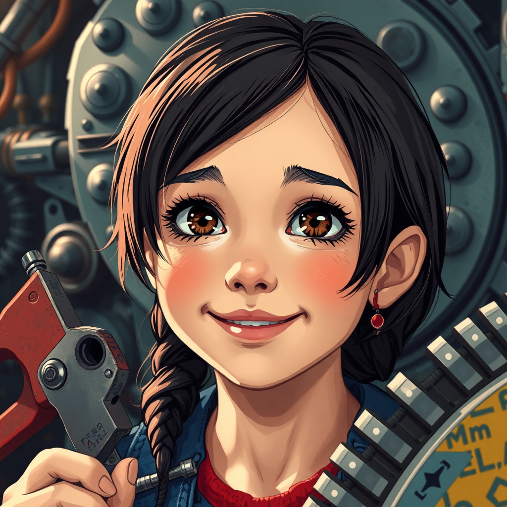 A young mechanic girl is captured in a close-up cinematic shot as she leisurely enjoys her afternoon. Her face is cute, happy, and brimming with energy, set against an intricately detailed dystopian mechanical interior. Her expression is innocent, with finely detailed eyes, nose, and lips. Surrounding her are ultra-detailed mechanical tools, like a wench and screwdriver, which highlight her craft. Rendered in 2D illustration style, the vibrant colors contrast yet harmonize with the backdrop, inspired by "Ghost in the Shell." The artwork reflects a stunning, masterpiece quality, emphasizing the young girl’s dynamic presence without losing the richness of her mechanical surroundings. The design excludes any deformations or low-quality elements, presenting a seamless and professional vector illustration with punchy visuals true to the essence of her character.