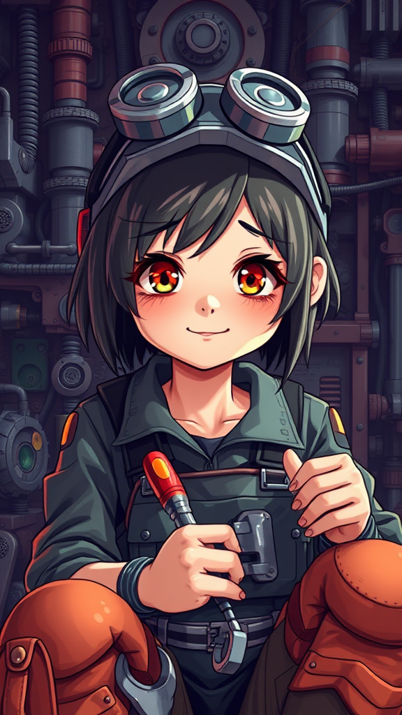 A young mechanic girl with a cute and happy face sits in a dystopian mechanical environment, surrounded by intricate details of an ultra-detailed mechanic interior. Her eyes sparkle with innocence and energy as she enjoys her afternoon. Her features, such as her nose and mouth, are finely detailed, adding to her charm. She is holding a wench and screwdriver, accessories that reflect her mechanical skills. The illustration, inspired by "Ghost in the Shell," features vibrant colors and stunning 2D vector design elements, displaying her in a cinematic and centered portrait. The background is a masterful blend of ultra-detailed mechanics, enhancing the overall composition with a touch of vibrant and energetic atmosphere.