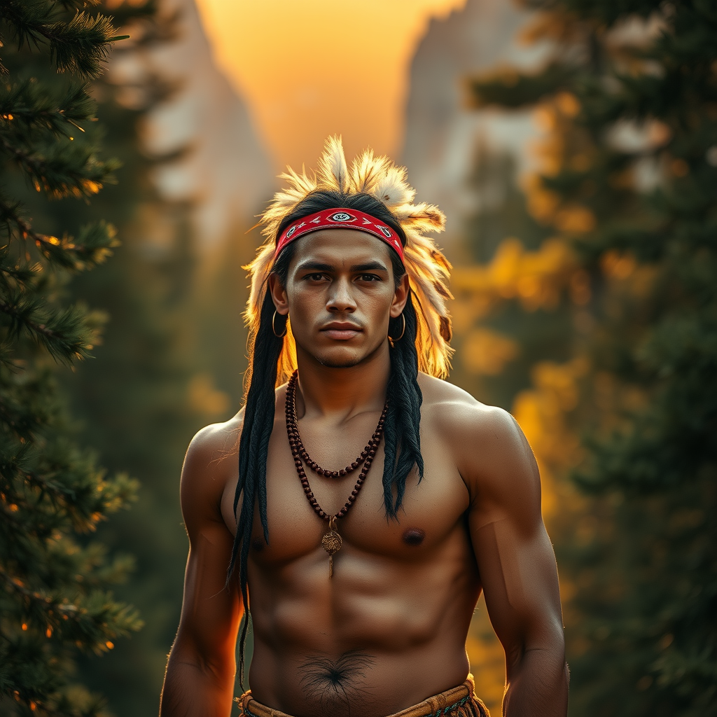 A young Native American man, athletic and full of vitality, stands amidst the towering mountains of Colorado. The photograph, captured with a Canon EOS R camera and a 50mm lens at f/2.8, ISO 100, and a shutter speed of 1/100 sec, bathes him in the soft, golden glow of the setting sun. His features are accentuated by the gentle light filtering through the forest canopy, casting a serene glow around him. The composition is meticulously arranged, placing him at the heart of the frame, enveloped by the dense, verdant foliage. The soft focus lends a dreamlike quality, enhancing the tranquility and peace of the scene. The overall image is an exquisitely beautiful portrait of the young man harmonizing with his natural surroundings, captured in stunning UHD DTM HDR 8k clarity.