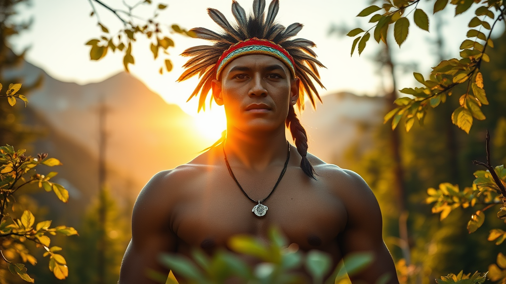 A young Native American man stands amidst the majestic mountains of Colorado, his powerful physique accentuated by the soft glow of the setting sun filtering through the forest leaves. The Canon EOS R camera, paired with a 50mm lens set to f/2.8, ISO 100, and a shutter speed of 1/100 sec, captures this moment with striking clarity. The natural golden hour light bathes the scene in warmth, creating a serene and ethereal ambiance. Positioned at the center of the frame, the young villager is surrounded by the vibrant greenery of the forest, his facial features beautifully highlighted. The composition is thoughtfully arranged, with a soft focus lending a dreamy quality to the portrait. This stunning UHD dtm HDR 8k image captures the essence of tranquility and connection to nature, showcasing a breathtaking portrayal of the young man in his native landscape.
