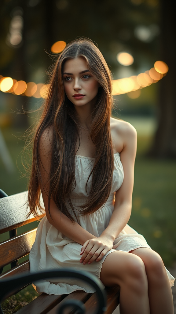 A young Russian woman in a delicate summer dress sits gracefully on a bench, her long dark blonde hair flowing in the gentle breeze. The cinematic atmosphere captures a photoshoot essence with a backdrop of soft bokeh, achieved through a 25mm lens that masterfully manipulates Depth of Field and Tilt Blur. Captured at a shutter speed of 1/1000 and an aperture of F/22, the image achieves pristine clarity with a white balance set at 32k for vivid color accuracy. Enhanced in super-resolution, the megapixel richness is displayed through the Pro Photo RGB spectrum. In a VR environment, the scene evokes solitude, portrayed with a sense of grandeur. Subtle half-rear lighting and dramatic backlighting interplay to produce incandescent moody tones. Optical fiber elements add a luminous touch, amplified by cinematic lighting techniques. Studio lighting blends seamlessly with volumetric conte-jour effects, accentuating her natural beauty. Advanced global illumination technologies like Screen Space Global Illumination, RayTracing Global Illumination, and Optics Scattering conjure a world of glowing shadows and shimmering textures. Ray Tracing Reflections and Lumen Reflections invoke a sense of depth, while Screen Space Reflections and Diffraction Grading add to the visual complexity. The use of Chromatic Aberration and GB Displacement creates artistic scan lines and intricate ray-traced ambient occlusion. Sophisticated Anti-Aliasing techniques such as FKAA, TXAA, RTX, and SSAO are employed alongside OpenGL-Shaders and GLSLShaders. Post-production artistry includes Cell Shading, Tone Mapping, CGI, with VFX and SFX for an insanely detailed outcome. The hyper maximalist design is elegant and dynamic, focused on ultra-detailed intricate patterns and an 8K resolution that captures ambient nuances, producing a mesmerizing narrative in a seamless blend of photography and volumetric artistry, embodying the spirit of the scene.