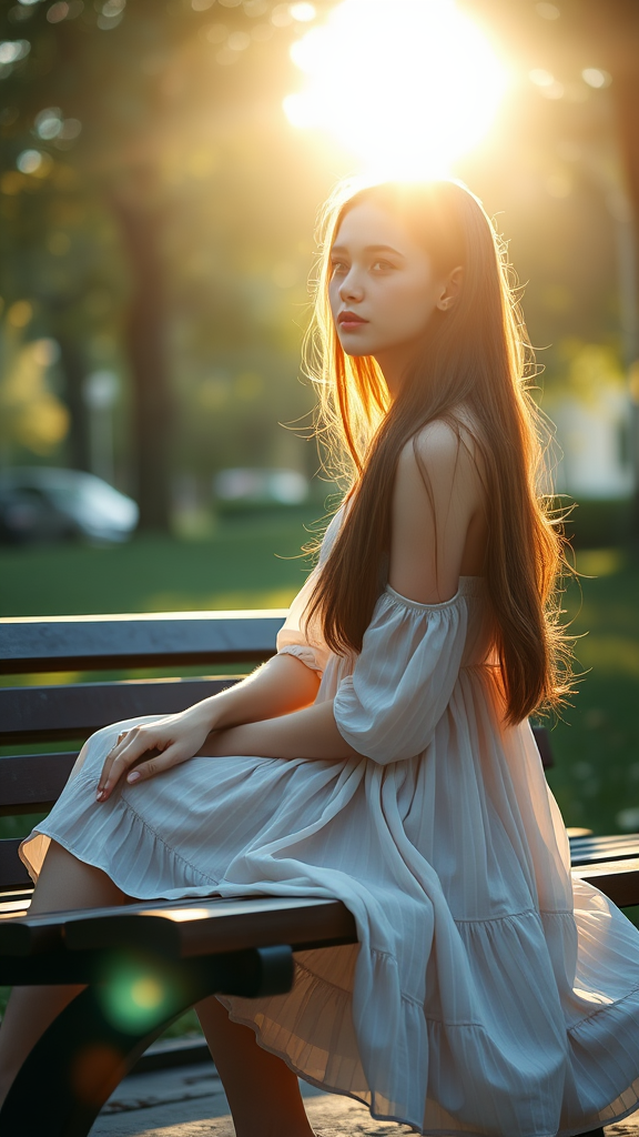 A young Russian woman in a flowing summer dress sits gracefully on a park bench, her long dark blond hair capturing the sunlight. The scene is cinematic, capturing a photoshoot essence with a bokeh effect, shot on a 25mm lens. Depth of field is emphasized with tilt blur, and the shutter speed is set to 1/1000, F/22. White balance is set at 32k, delivering super-resolution in megapixel clarity with Pro Photo RGB, creating a visually rich VR experience. The atmosphere is solitary yet comforting, enhanced by massive backlighting and dramatic incandescent lighting effects. Optical fibers add a moody and cinematic lighting presence, combined with studio-style soft lighting. A volumetric look and contre-jour technique are utilized for beautiful accent lighting, supported by global illumination and screen space global illumination. Ray tracing plays a key role in global illumination, optics, and scattering, creating glowing and shimmering shadows. Reflections are phenomenally executed with ray tracing, Lumen reflections, and screen space reflections, while diffraction grading introduces chromatic aberration. GB displacement and scan lines add texture, and ray tracing ambient occlusion enhances depth. Advanced anti-aliasing methods like FKAA and TXAA are used alongside RTX and SSAO technologies. The shaders, including OpenGL and GLSL shaders, ensure post-processing achieves a polished CGI and VFX impact. Insanely detailed and intricate, this hyper-maximalist and elegant scene captures an ultra-detailed dynamic pose, photographed in 8K for stunning super detailed ambient scenery.