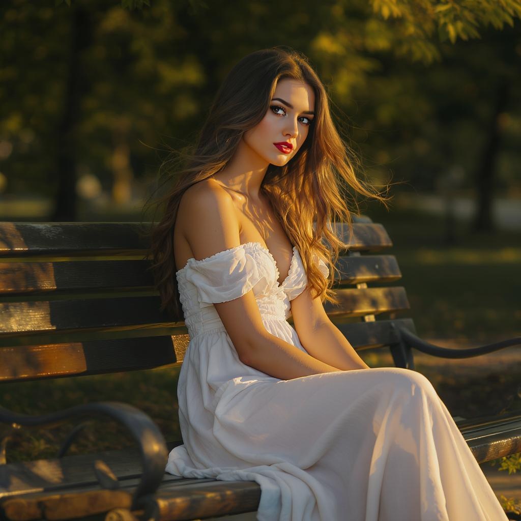 A young Russian woman in a flowing summer dress sits on a park bench, her long dark blond hair cascading around her. The scene is cinematic, capturing the essence of a photoshoot with a bokeh background. Shot on a 25mm lens, the image boasts an impressive depth of field with a tilt blur effect. The camera settings include a fast shutter speed of 1/1000, an aperture of F/22, and a white balance set to 32k. Utilizing super-resolution and megapixel clarity, the scene is presented in Pro Photo RGB, evoking a sense of solitude yet highlighting her elegant presence. The lighting is meticulously crafted, employing techniques such as halfrear and backlighting, with dramatic incandescent tones casting moody shadows. Optical fibers and volumetric lighting enhance the scene, creating a conte-jour effect with beautiful, accentuated illumination. The use of screen space global illumination and ray-traced reflections adds a shimmering quality, while diffraction grading and chromatic aberration introduce artistic elements. The image is enriched by advanced visual effects, including ray-traced ambient occlusion, anti-aliasing, and sophisticated shaders. Post-processing techniques like cell shading and tone mapping enhance the visual narrative, producing an insanely detailed masterpiece. This ultra-detailed photograph with intricate details is captured in 8K, showcasing a dynamic pose that exudes elegance, enveloped in ambient light.