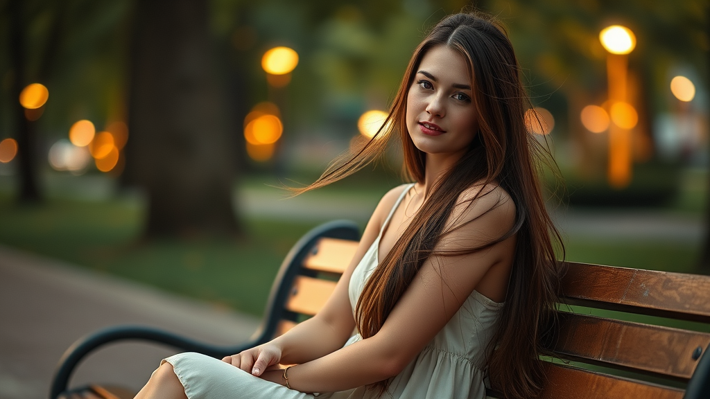A young Russian woman in a light summer dress elegantly sits on a park bench, her long, flowing dark blonde hair catching the breeze. Captured cinematically, with an enchanting bokeh effect, the scene utilizes a 25mm lens for a detailed depth of field and tilt blur. Shot at a shutter speed of 1/1000 and F/22, the image is warm and inviting with a white balance set at 3200K. Enhanced in super-resolution and megapixel clarity, the Pro Photo RGB color space captures the subtle emotion of her expression. She exudes a sense of serene solitude. The lighting combines half-rear, backlight, and dramatic incandescent sources to create a mood that's both cinematic and intimate. Soft and moody lighting envelops the scene, with volumetric effects hinting at the passage of time. Beautiful accent lighting creates depth, while global illuminationâutilizing ray tracing techniques like Screen Space and Ray Tracing Global Illuminationâadds realism. The complex optics and scattering effects render her aura almost shimmering, with dynamic shadows playing across the setting. Ray-traced reflections and Lumen reflections heighten the realism, while screen space reflections add depth. The environment glows with an aura of elegance, hinted by chromatic aberration and diffraction grading. The photo exhibits GB displacement with subtle scan lines, enhanced by ray tracing ambient occlusion. Advanced anti-aliasing techniques like FKAA, TXAA, and RTX clear the image, while shadersâOpenGL, GLSLâoffer post-processing finesse. The intricate details emerge through CGI, VFX, SFX effects, presenting a hyper-detailed, ultra-maximalist visual narrative. The dynamic pose captures a perfect moment in time, rendered in stunning 8K resolution, with ambient uplighting in a 9:16 aspect ratio.