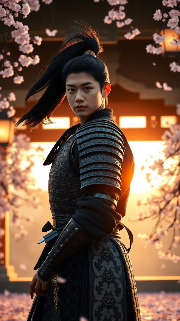 A young samurai with flowing black hair in a ponytail, clad in intricate samurai armor, stands proudly in a serene Japanese temple surrounded by the soft cascade of cherry blossom petals. The scene is bathed in the warm glow of sunrise, with gently illuminated lanterns casting a tranquil and ethereal light. Delicate shadows dance across the temple's architecture, creating a dramatic interplay of light and dark. Rendered in ultra-high resolution 8K, the image captures hyper-realistic details with rich colors and lifelike textures, as if shot with a professional f1.6 lens. The blend of physics-based rendering and hyperrealism gives the photo a cinematic quality, akin to a Cinestill 800 film, capturing the soul of the scene with stunning clarity and depth.