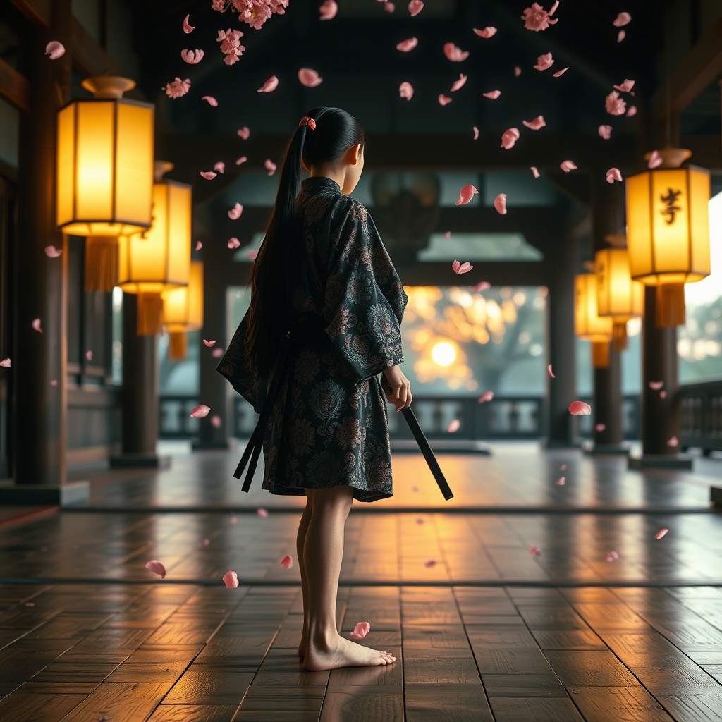 A young samurai with long black hair tied in a ponytail stands barefoot in a serene Japanese temple, wearing a short, intricately patterned kimono. Cherry blossom petals drift gently through the air, creating a soft shower of pink around him. Illuminated lanterns cast a warm glow as the sunrise paints the scene in tranquil and ethereal hues. Delicate and dramatic shadows dance across the temple’s wooden floors, Enhancing the rich textures and details. The atmosphere is infused with a hyper-realistic quality, captured in ultra high resolution. This professional photograph, taken with an f1.6 lens, showcases vibrant colors and lifelike textures, reminiscent of a cinestill 800 film. The image combines high contrast and hyperrealism, resulting in a breathtakingly realistic portrayal of a timeless moment.