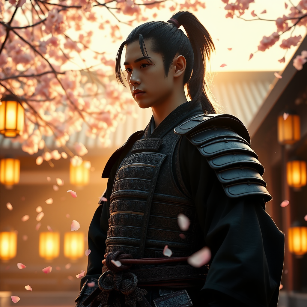 A young samurai with long black hair tied in a ponytail stands gracefully in a Japanese temple, adorned in intricately detailed samurai armor. Around him, cherry blossom petals gently drift through the air, casting delicate shadows in the soft glow of illuminated lanterns. The scene is bathed in the warm, golden light of a glowing sunrise, creating a serene and ethereal atmosphere. This high-detail, ultra-high-resolution image captures the tranquility and beauty of the moment, with lifelike textures and rich, vibrant colors. The composition employs physics-based rendering to achieve hyperrealism, akin to a professional photo taken with an f1.6 lens, bringing every detail into sharp relief. The overall effect is a stunning, artistic portrayal of a timeless scene, suitable for an 8K CG wallpaper that showcases dramatic lighting and hyper-realistic textures.