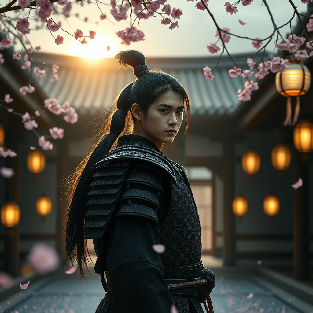 A young samurai with long flowing black hair tied in a ponytail stands proudly in the serene atmosphere of a traditional Japanese temple. He is clad in intricately designed samurai armor, exuding strength and honor. Around him, the delicate petals of cherry blossoms gently fall, caught in the soft glow of illuminated lanterns. As the sun rises in the distance, its light casts an ethereal glow, creating tranquil lighting and delicate shadows across the scene. The atmosphere is enhanced by dramatic lighting that accentuates the high detail and vibrant colors in a realistic, ultra-high resolution image. The texture is lifelike, captured with a photography style reminiscent of a cinestill 800 film with an f1.6 lens, providing rich colors and hyper-realistic detail. This scene, rendered in highly detailed CG, offers a unified 8K wallpaper experience with physics-based rendering that highlights the realism and vivid contrast of this momentous setting.