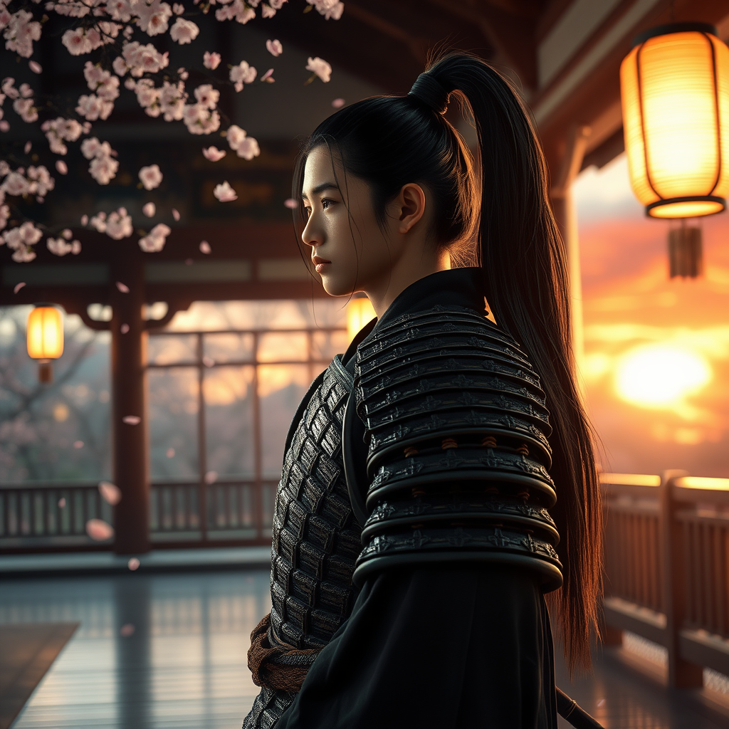 A young samurai with long, silky black hair tied in a sleek ponytail, adorned in intricately detailed samurai armor, stands poised in the serene ambiance of a traditional Japanese temple. Delicate cherry blossom petals drift gently through the air, while the soft glow of illuminated lanterns casts a warm glow across the scene. The sunrise paints the sky in vibrant hues, infusing the environment with tranquil and ethereal light. Delicate shadows stretch across the temple's wooden floor, adding depth to the high-contrast setting. Captured with a professional eye, the ultra-high-resolution image boasts rich, lifelike textures and colors, woven together with hyperrealistic detail. Using a cinestill 800 film effect and a physics-based rendering approach, the composition is a harmonious blend of cinematic realism, enhanced deep contrasts, and hyper-realistic lifelike textures, all viewed through the precision of an f1.6 lens.